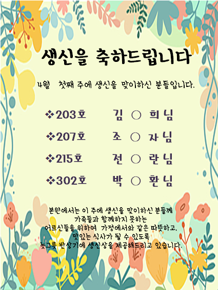 이번주 생일을 맞은 병원 가족에게 따듯한 격려 부탁드립니다.