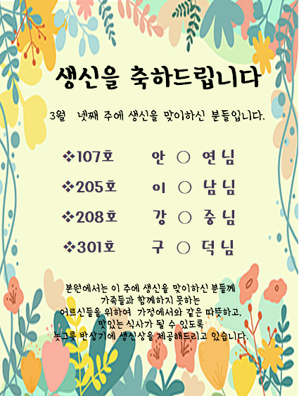 이번주 생일을 맞은 병원 가족에게 따듯한 격려 부탁드립니다.