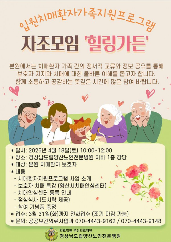 목록 자조모임 '힐링가든' 참여자를 모집합니다. 페이지 정보 작성자최고관리자 댓글0건 조회15회 작성일26.03.18 10:50 본문 자조모임 '힐링가든' 참여자를 모집합니다. 이전글정기 자원봉사자를 모집합니다(이미용, 개인봉사 등) 26.03.18 다음글2025년 공립요양병원 공공보건사업(치매환자지원프로그램) 정보공시 확정 알림 26.03.10 댓글 0 댓글목록 등록된 댓글이 없습니다.
