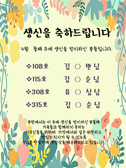 이번주 생일을 맞은 병원 가족에게 따듯한 격려 부탁드립니다.