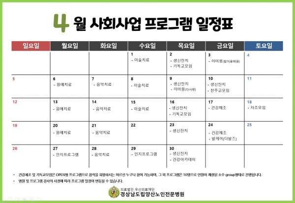 목록 4월 프로그램 일정 페이지 정보 작성자최고관리자 댓글0건 조회3회 작성일26.04.20 09:45 본문 4월 프로그램 일정 다음글경상남도립양산노인전문병원 경상남도 표창 수상 26.04.13 댓글 0 댓글목록 등록된 댓글이 없습니다.