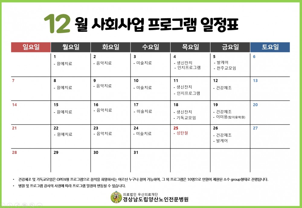 목록 12월 프로그램 일정표 페이지 정보 작성자최고관리자 댓글0 조회2 작성일25.11.28 14:35 본문 12월 프로그램 일정표 다음글11월 프로그램 일정표 25.11.26 Comment 0 댓글목록 등록된 댓글이 없습니다.