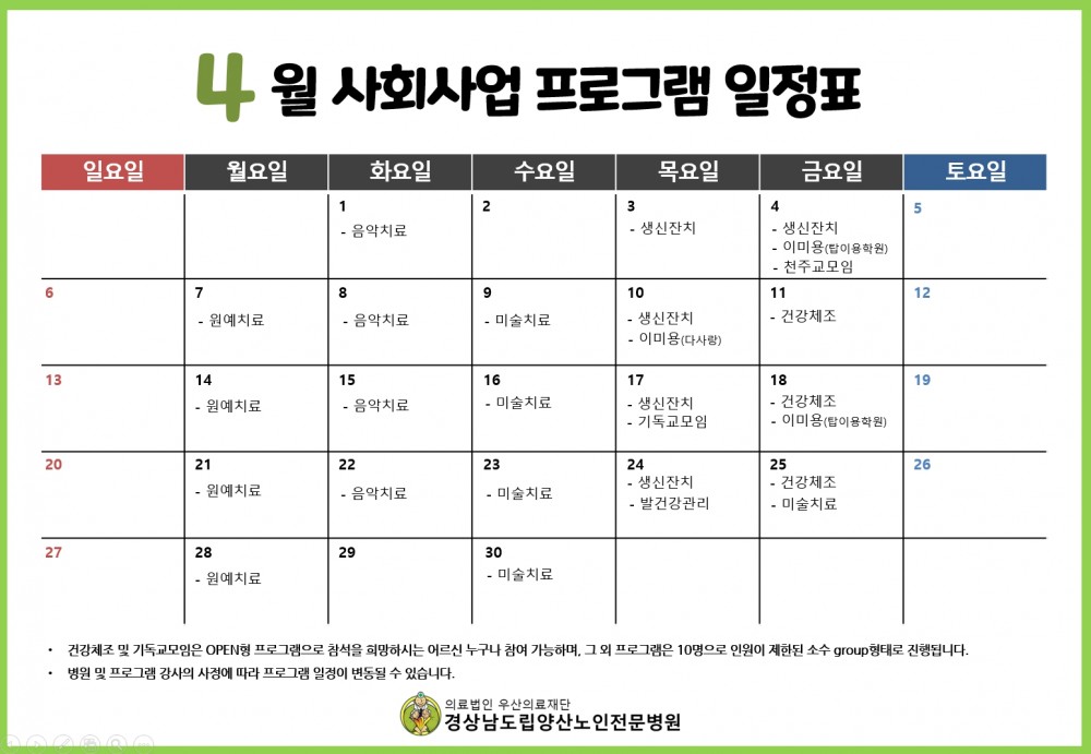 목록 4월 프로그램 일정표 페이지 정보 작성자최고관리자 댓글0 조회179 작성일25.04.03 10:00 본문 4월 프로그램 일정표 이전글5월 사회사업 프로그램 25.05.07 다음글3월 프로그램 일정표 25.02.27 Comment 0 댓글목록 등록된 댓글이 없습니다.